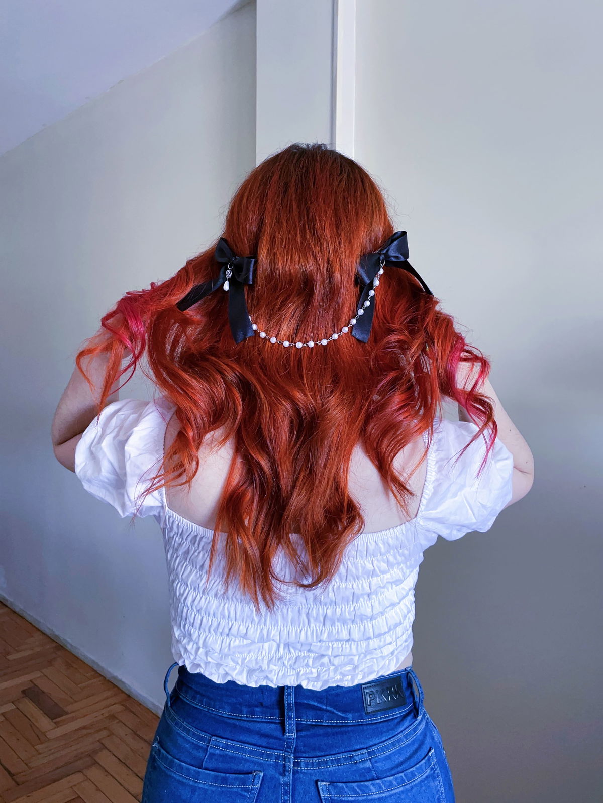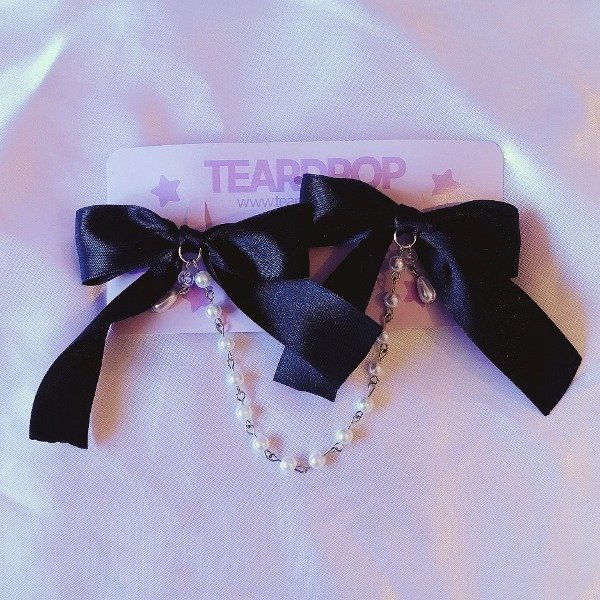 producto: hebillas con moños de cinta raso negra conectadas por perlas enhebradas en alambre