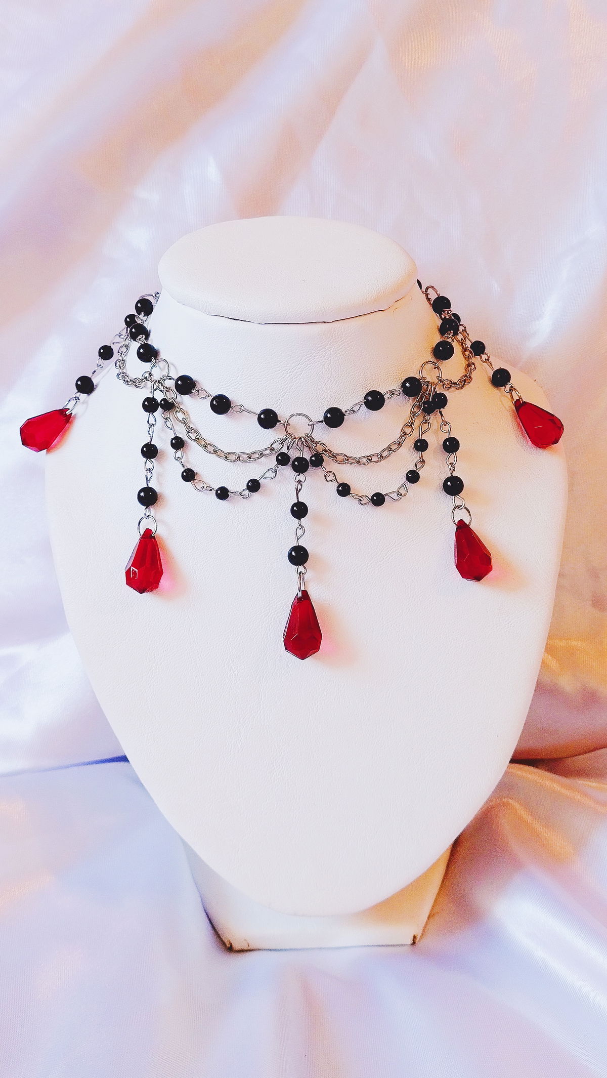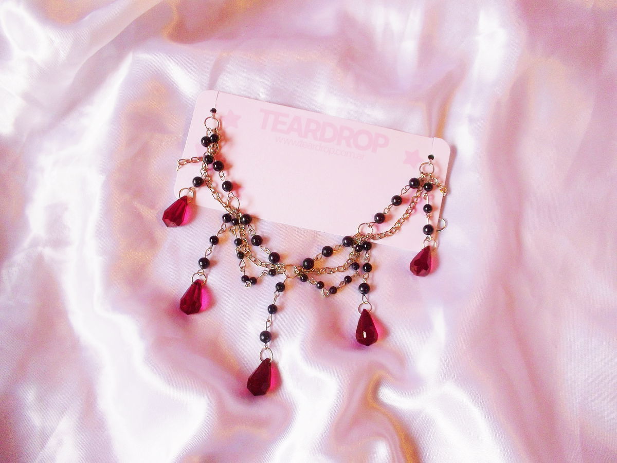 perlas: negras plásticas y caireles rojos